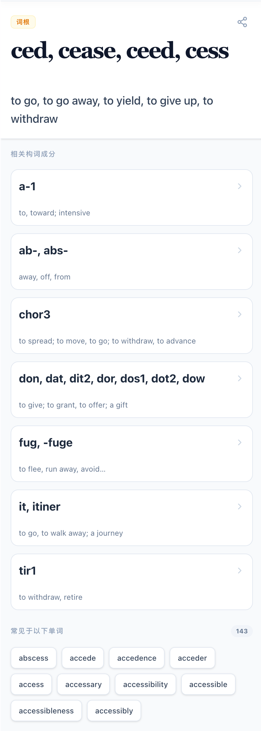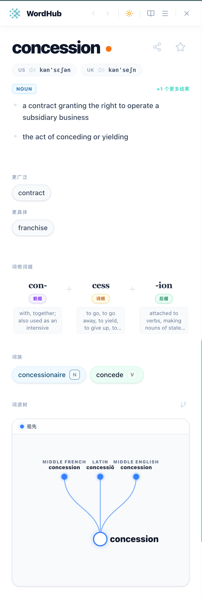 WordHub can surface word breakdowns and root families, which helps you learn patterns—not isolated definitions.